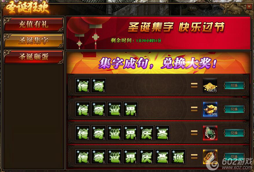 2、活动期间,玩家可用不同字组合兑换相应道具(盾牌碎片、雪人召唤令等高级道具,击杀雪人BOSS可掉落圣诞专属时装-圣诞祝福)