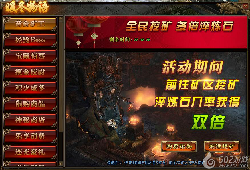 2、注意:必须使用“鹤嘴锄”才可获得“淬炼石”,在VIP矿区可安全挖矿;