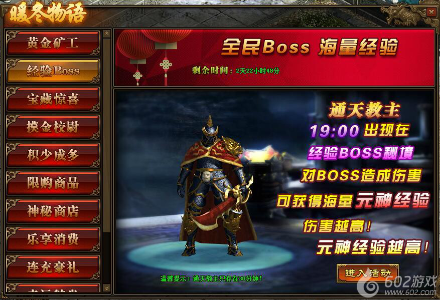 2、活动中,玩家对BOSS造成的伤害,将在活动结束后转换成元神经验并发放;