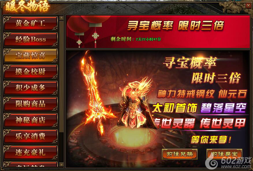 1、活动期间,玩家寻宝概率翻倍,极高几率获得太初套装,特戒钢纹,碧落星空、仙元石以及<绝对防御>灵器-传世灵器、传世灵甲;