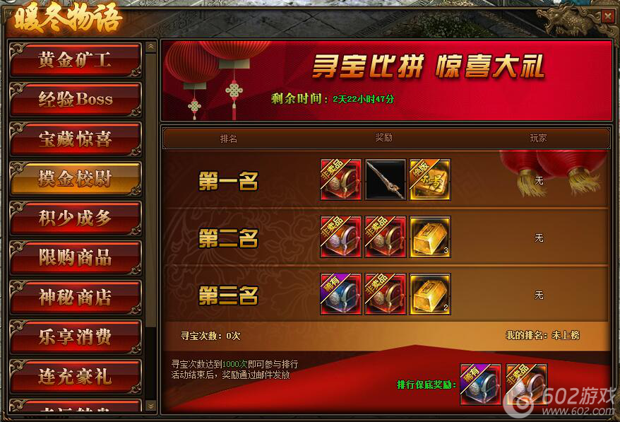 1、活动期间,玩家寻宝次数达到1000次即可参与到摸金校尉排行榜中