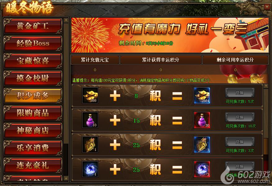 1、活动期间,每充值100元宝可获得1积分,消耗指定物品和积分即可将1个物品变成3个;