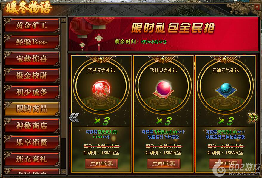 1、活动期间,玩家可在活动面板购买限购商品;(可翻页)