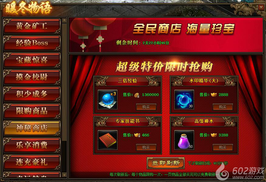 2、神秘商店每2小时自动刷新一次,也可用花费元宝立即刷新;