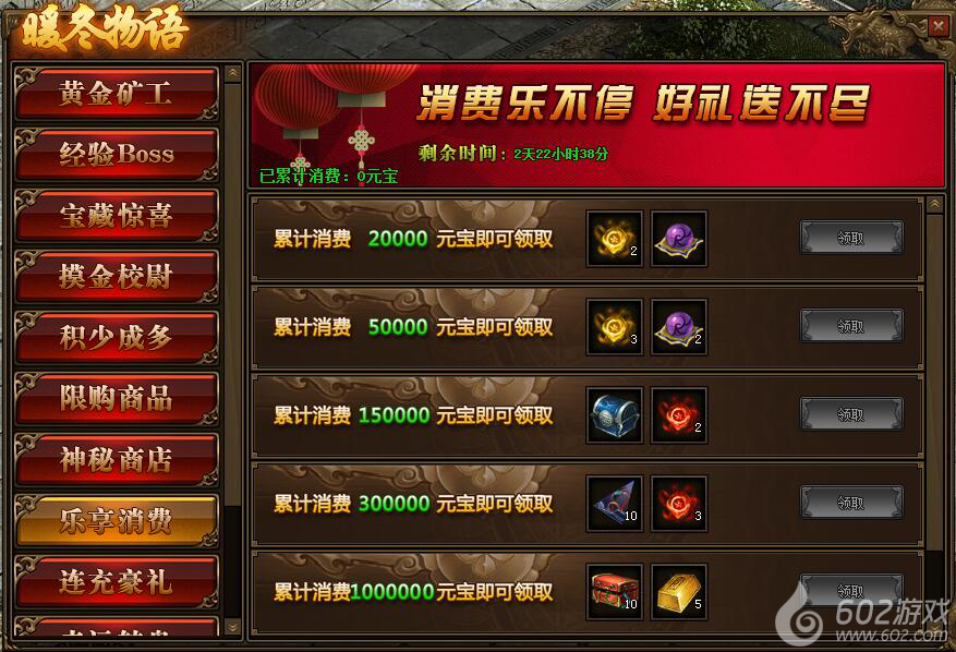 1、活动期间,玩家累计消费满足要求,可以领取洪荒首饰、修罗之羽宝盒、传世灵戒等相应奖励;