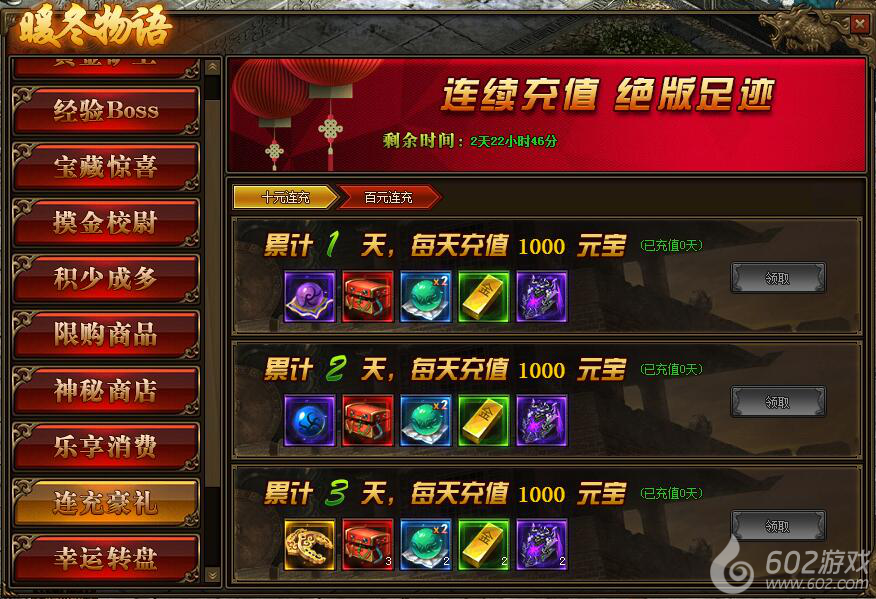 2、累积充值达到三天,可领取绝版足迹,更多特戒礼盒奖励。