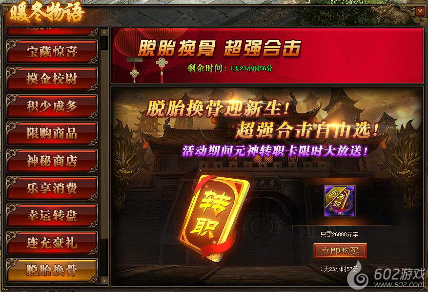 1、活动期间,玩家可在活动面板中购买元神转职卡,让元神脱胎换骨;