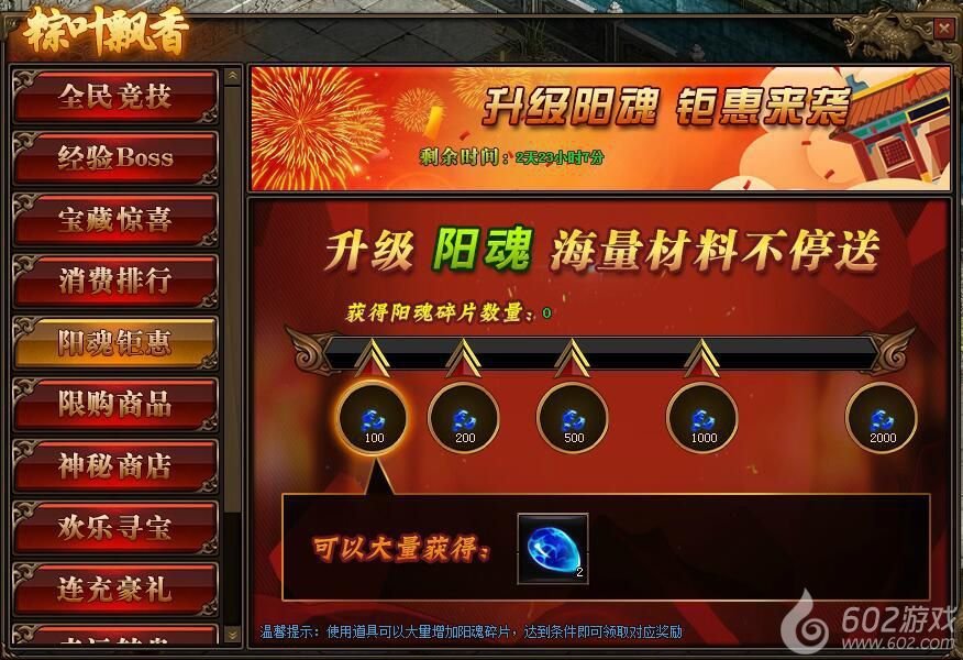 1.活动期间,玩家获得阳魂碎片数量,达到条件可领取对应阳魂碎片奖励。