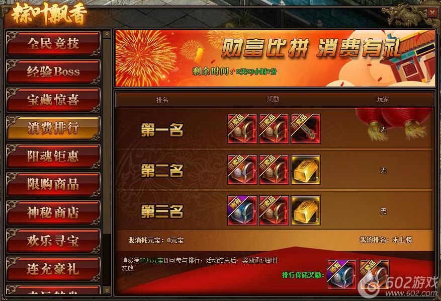 1.活动期间,玩家消费满30万元宝参与排行