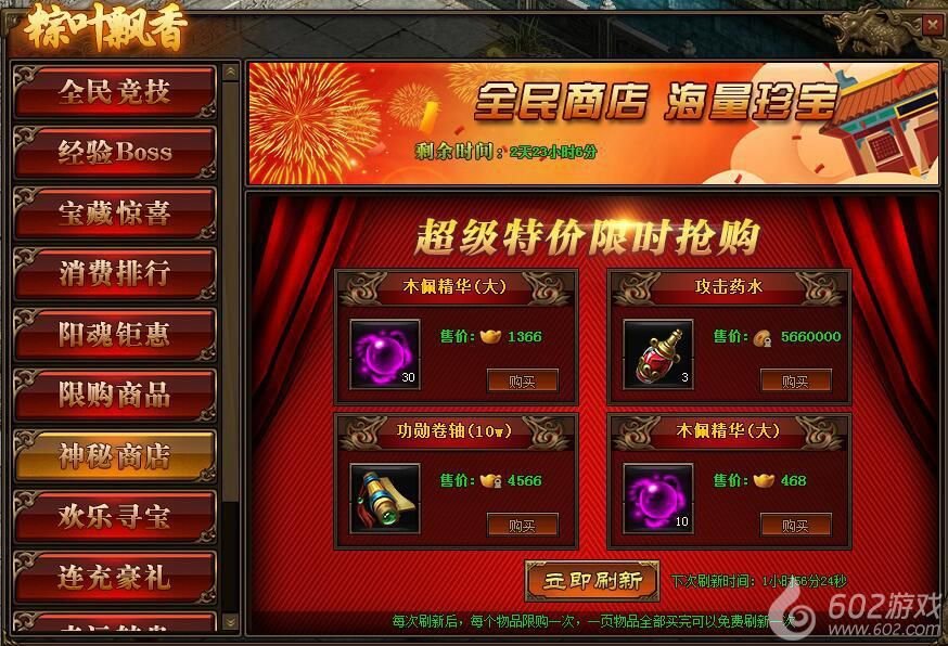 2.神秘商店每2小时自动刷新一次,也可用花费元宝立即刷新;