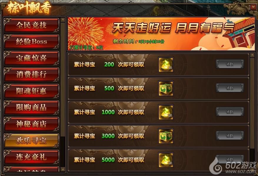 1.活动期间,玩家累计寻宝次数满足要求,可以领取阵法精华(中)、虎翼阵法宝箱、龙飞阵法宝箱、云垂阵法宝箱等相应奖励;