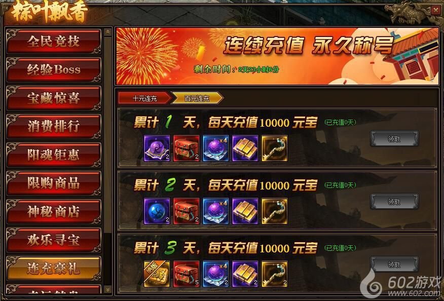 1.活动期间,每天充值10元、100元可领取境界修为、特戒礼盒。