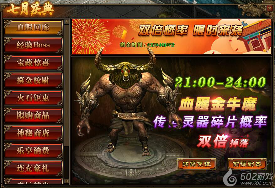1. 活动期间,玩家参与“多人副本-血腥回廊”,获得“传世灵器碎片”的概率翻倍;