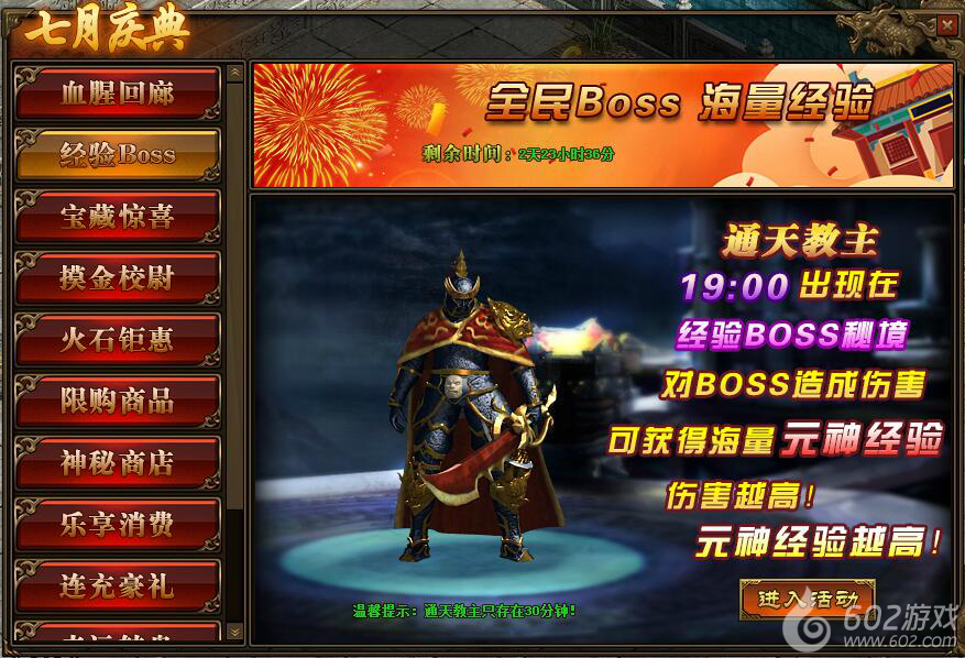 2.活动中,玩家对BOSS造成的伤害,将在活动结束后转换成元神经验并发放;