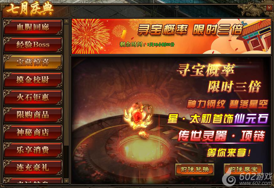 1.活动期间,玩家寻宝概率翻倍,极高几率获得星·太初首饰,星石材料,仙元石、碧落星空,神力特戒钢纹,以及传世灵器·项链碎片