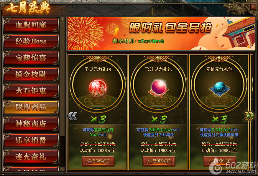 1.活动期间,玩家可在活动面板购买限购商品;(可翻页)