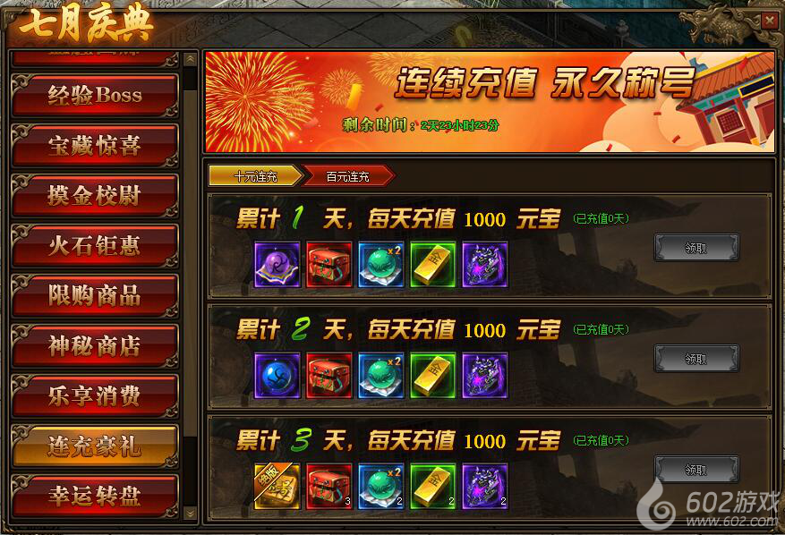 1.活动期间,每天充值10元、100元可领取境界修为、特戒礼盒。