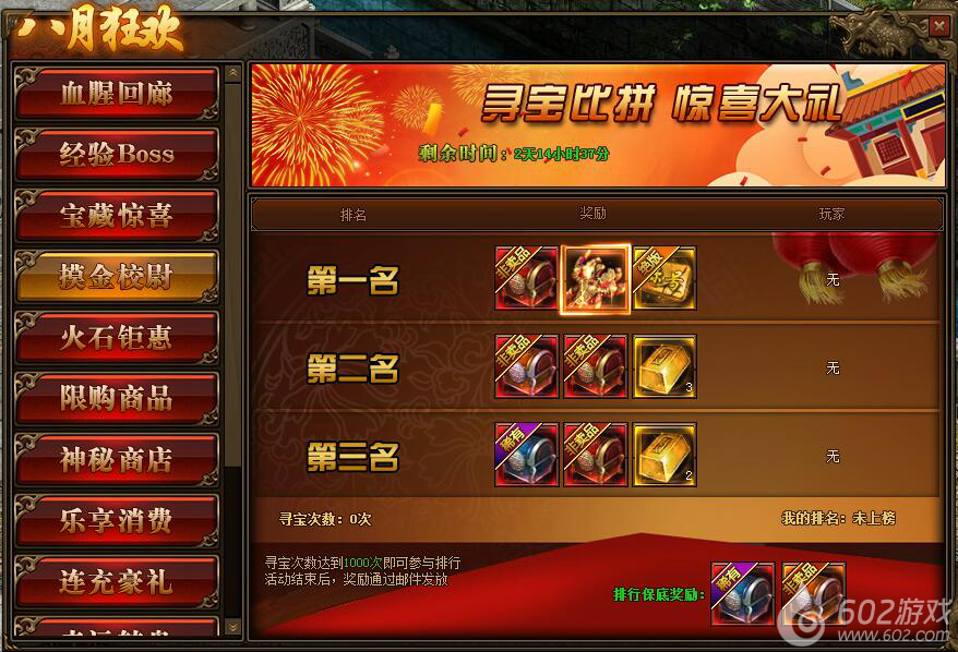 1.活动期间,玩家寻宝次数达到1000次即可参与到摸金校尉排行榜中