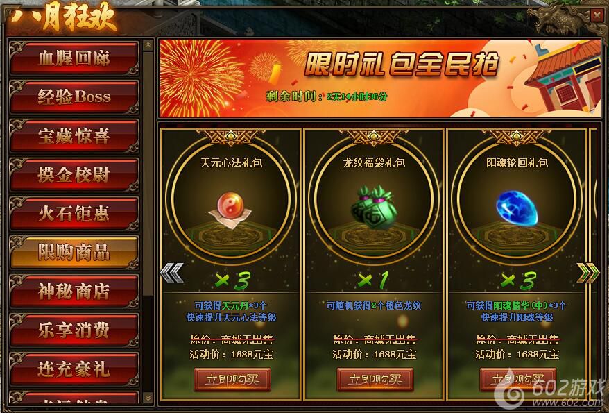 1.活动期间,玩家可在活动面板购买限购商品;(可翻页)