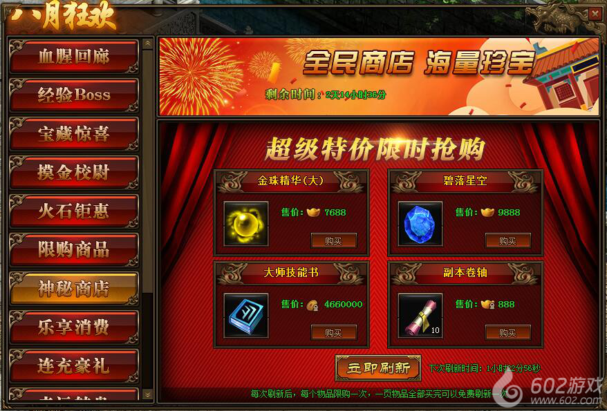 2.神秘商店每2小时自动刷新一次,也可用花费元宝立即刷新;