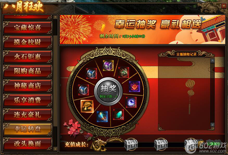 1.活动期间内,每日充值可增加充值成长值,达到一定充值成长值后可领取抽奖次数,每日最多获得3次抽奖机会;