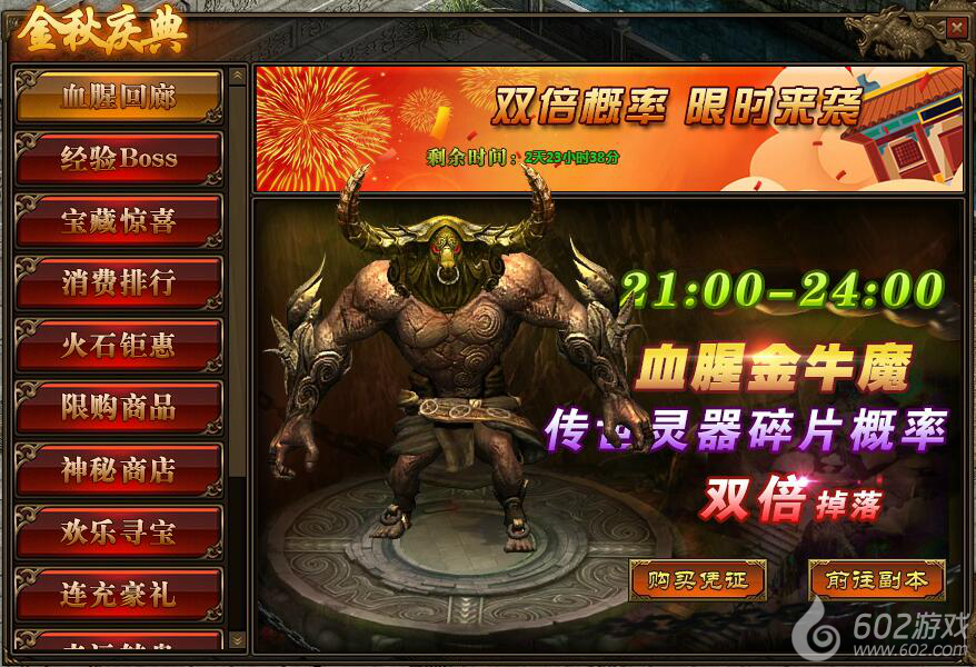 1. 活动期间,玩家参与“多人副本-血腥回廊”,获得“传世灵器碎片”的概率翻倍;