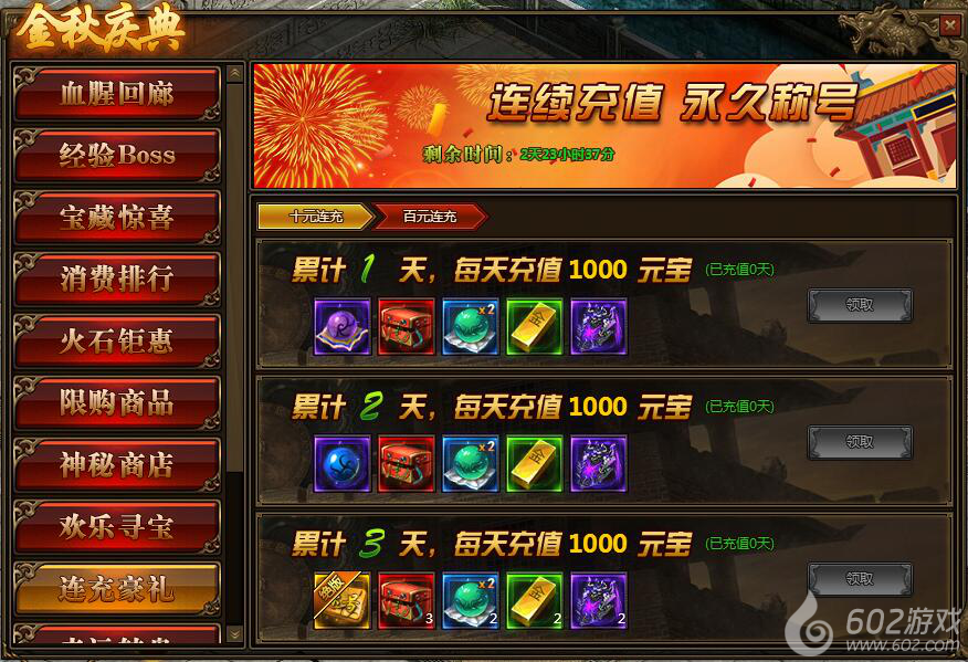 1.活动期间,每天充值10元、100元可领取境界修为、特戒礼盒。