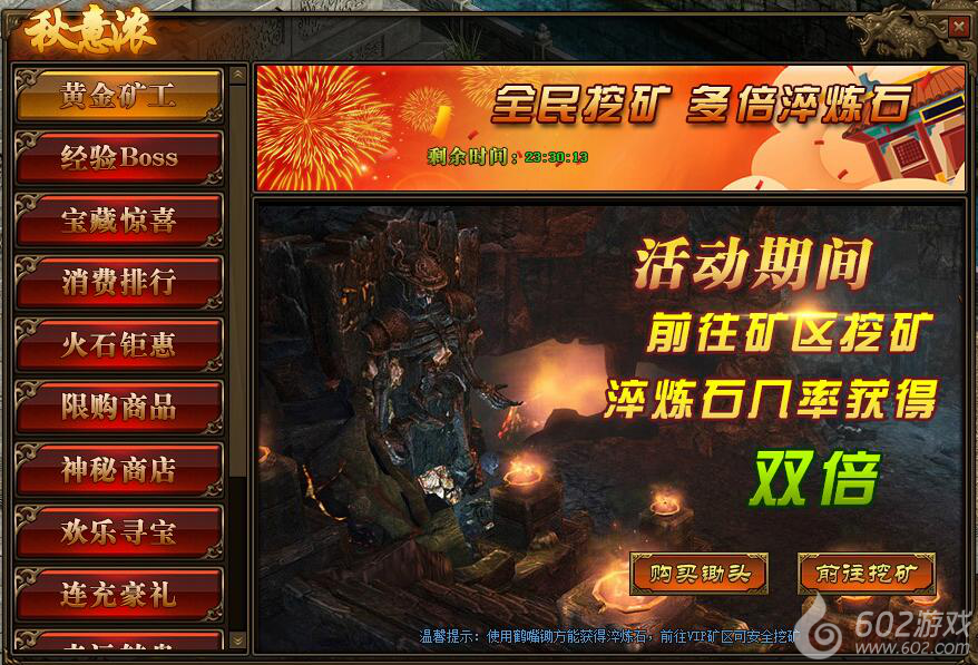 2.注意:必须使用“鹤嘴锄”才可获得“淬炼石”,在VIP矿区可安全挖矿;