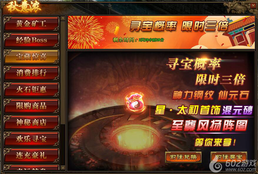 1.活动期间,玩家寻宝概率翻倍,极高几率获得星·太初首饰,仙元石、混元砂,神力特戒钢纹,以及至尊风扬阵图