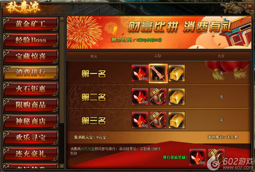 1.活动期间,玩家消费满30万元宝参与排行