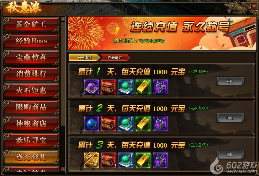 1.活动期间,每天充值10元、100元可领取境界修为、特戒礼盒。