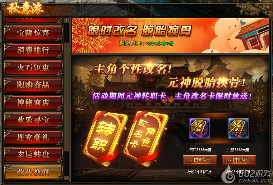 2.活动期间,玩家可在活动面板中购买主角改名卡,让你的名字个性十足;
