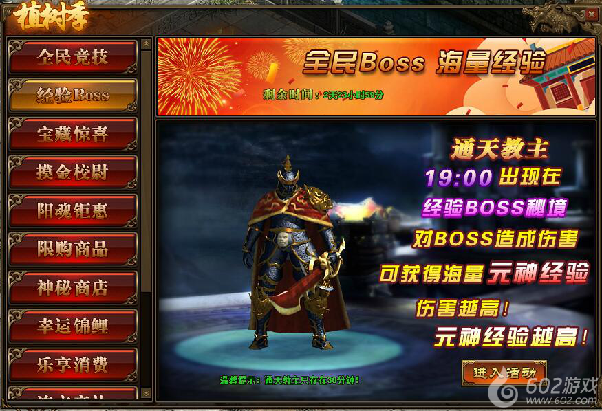 2.活动中,玩家对BOSS造成的伤害,将在活动结束后转换成元神经验并发放;