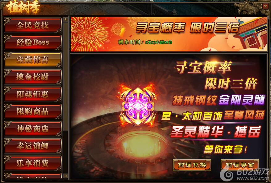 1.活动期间,玩家寻宝概率翻倍,极高几率获得星·太初首饰,仙元石、混元砂,神力特戒钢纹,传世灵器、传世灵甲,金刚精华、金刚灵髓,圣灵精华(撼岳)以及至尊风扬阵法