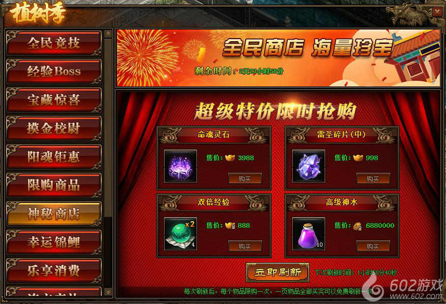 2.神秘商店每2小时自动刷新一次,也可用花费元宝立即刷新;