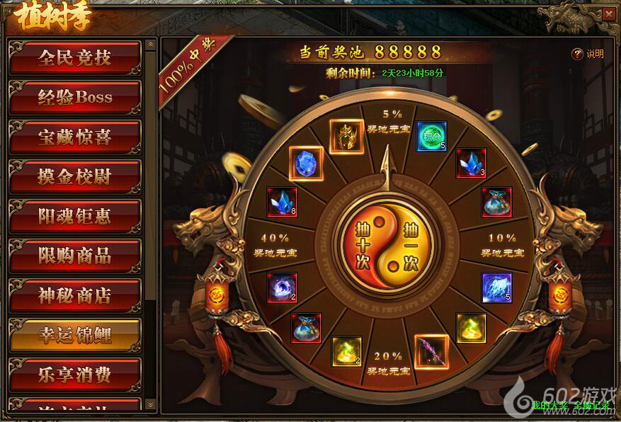 1.活动开启后奖池内默认存入88888元宝,每抽奖1次可使奖池内增加100元宝
