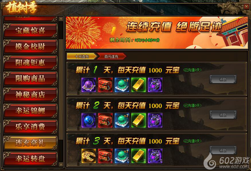 1.活动期间,每天充值10元、100元可领取境界修为、特戒礼盒。