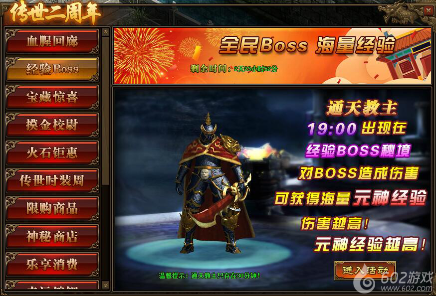 2.活动中,玩家对BOSS造成的伤害,将在活动结束后转换成元神经验并发放;