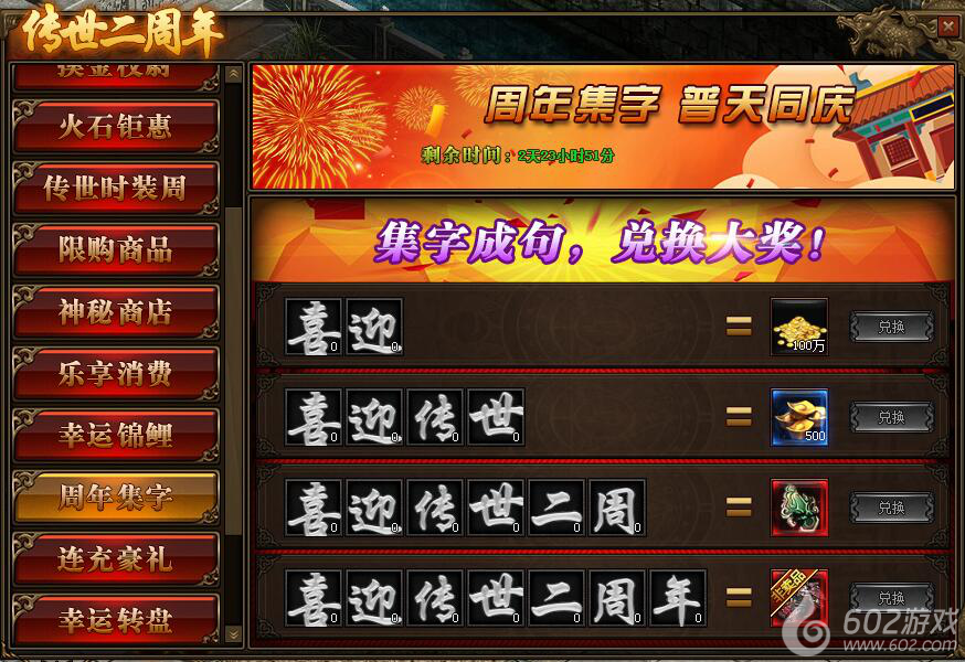 1.活动期间,玩家可通过击杀BOSS获得“喜迎传世二周年”七字