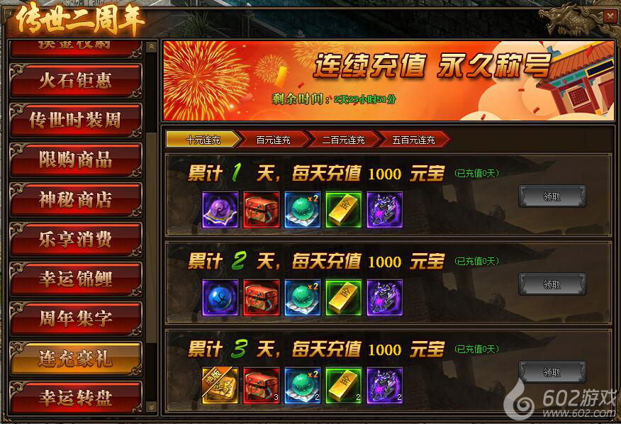 1.活动期间,每天充值10元、100元、200元、500元可领取境界修为、特戒礼盒。