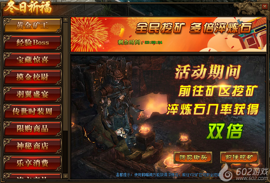 2.注意:必须使用“鹤嘴锄”才可获得“淬炼石”,在VIP矿区可安全挖矿;