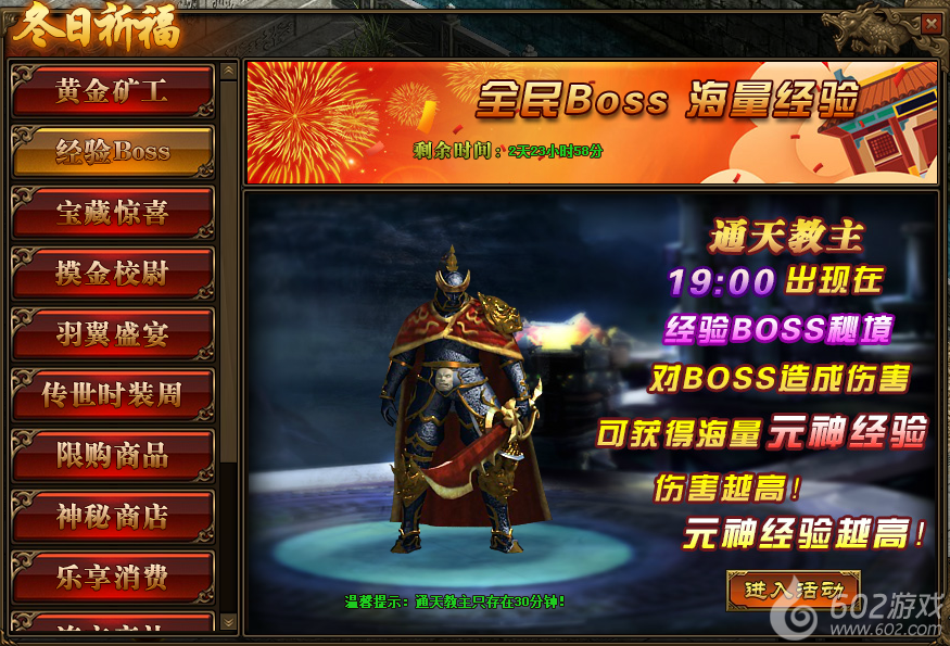 2.活动中,玩家对BOSS造成的伤害,将在活动结束后转换成元神经验并发放;