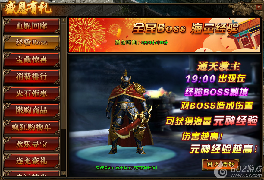 2.活动中,玩家对BOSS造成的伤害,将在活动结束后转换成元神经验并发放;
