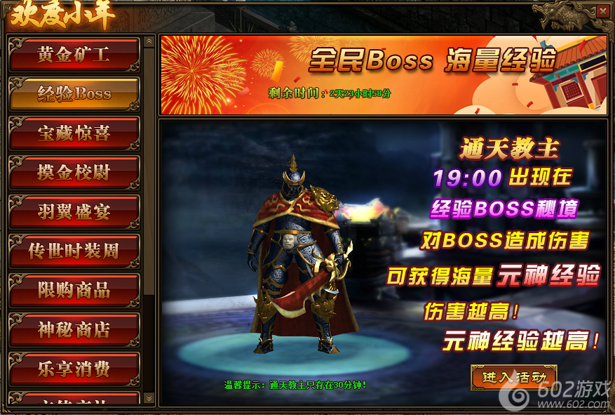 2.活动中,玩家对BOSS造成的伤害,将在活动结束后转换成元神经验并发放;