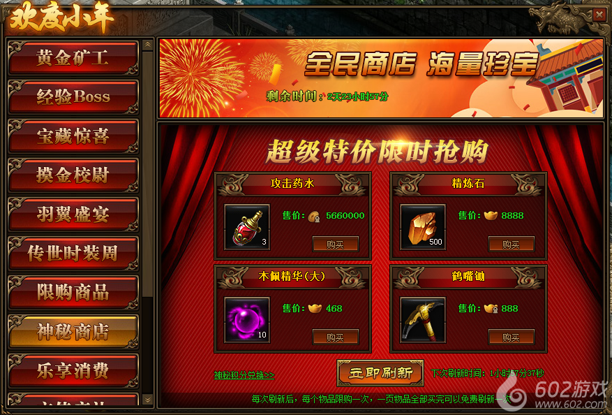 2.神秘商店每2小时自动刷新一次,也可用花费元宝立即刷新;
