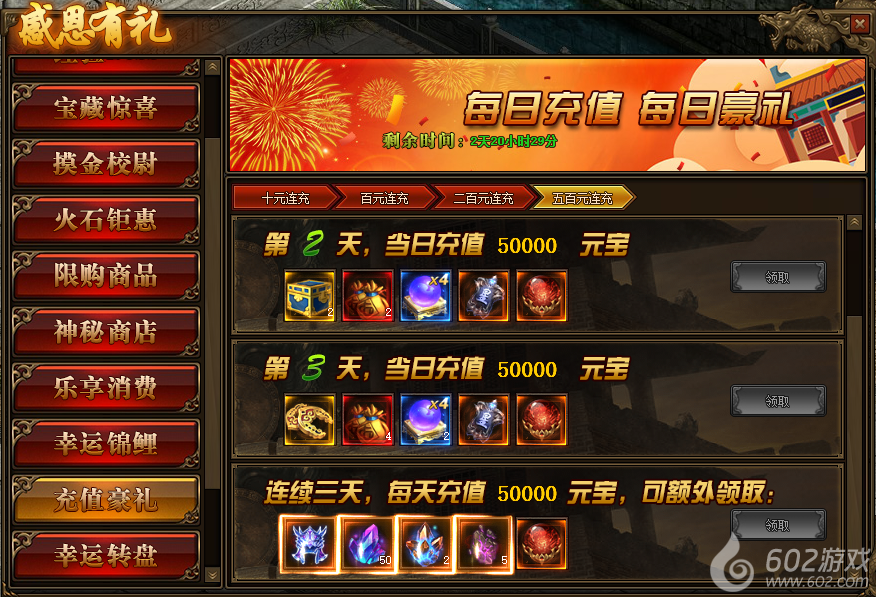 2.连续充值达到3天,奖励翻倍领,更可领取暗影晶石、地狱晶石、雷霆装备等贵重物品