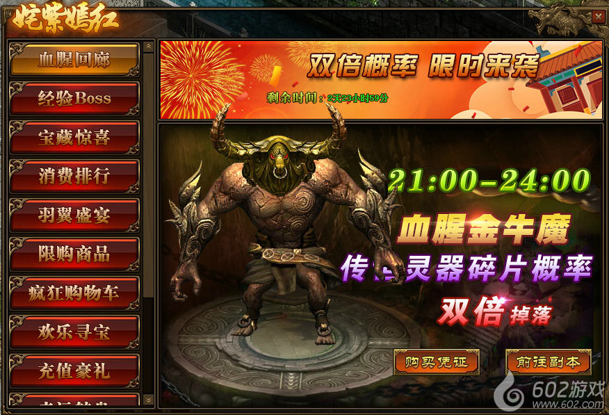 1.活动期间,玩家参与“多人副本-血腥回廊”,获得“传世灵器碎片”的概率翻倍;