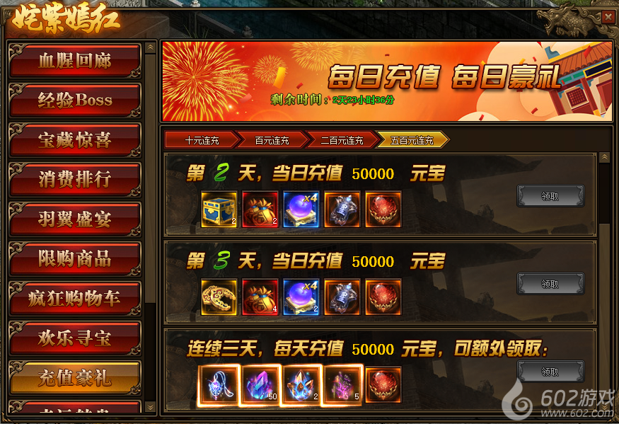 2.连续充值达到3天,奖励翻倍领,更可领取暗影晶石、地狱晶石、随机7级阵法宝珠、雷霆装备等贵重物品