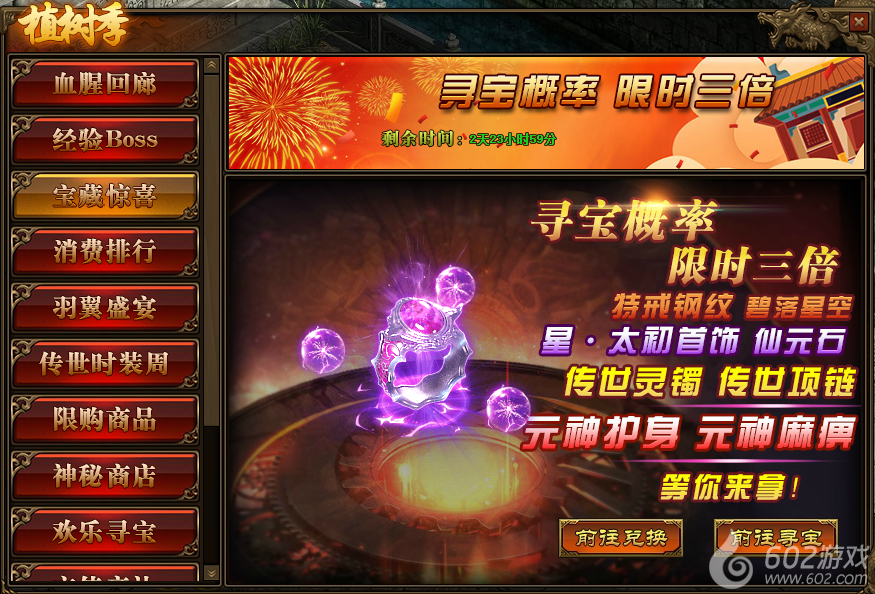1.活动期间,玩家寻宝概率翻倍,极高几率获得星·太初首饰,特戒钢纹、仙元石、碧落星空,传世灵器、传世灵甲,传世灵器·手镯碎片、传世灵器·项链碎片,元神护身特戒以及元神麻痹特戒