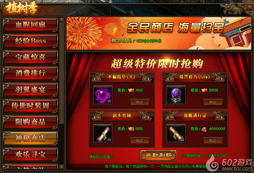 2.神秘商店每2小时自动刷新一次,也可用花费元宝立即刷新;